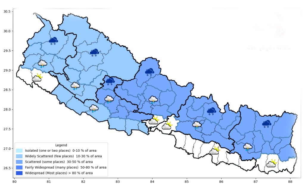 जल तथा मौसम विज्ञान विभाग, मौसम पूर्वानुमान महाशाखाका अनुसार आज दिउँसो देशभर साधारणतया बादल लाग्नेछ । कोशी, बागमती, गण्डकी र लुम्बिनी प्रदेशको पहाडी र हिमाली भूभागका थोरै स्थान साथै कर्णाली र सुदूरपश्चिम प्रदेशका पहाडी र हिमाली भूभाग तथा लुम्बिनी प्रदेशको तराई भूभागका एकदुई स्थानमा मेघगर्जन र चट्याङसहित हल्का वर्षा र हिमपातको सम्भावना छ ।