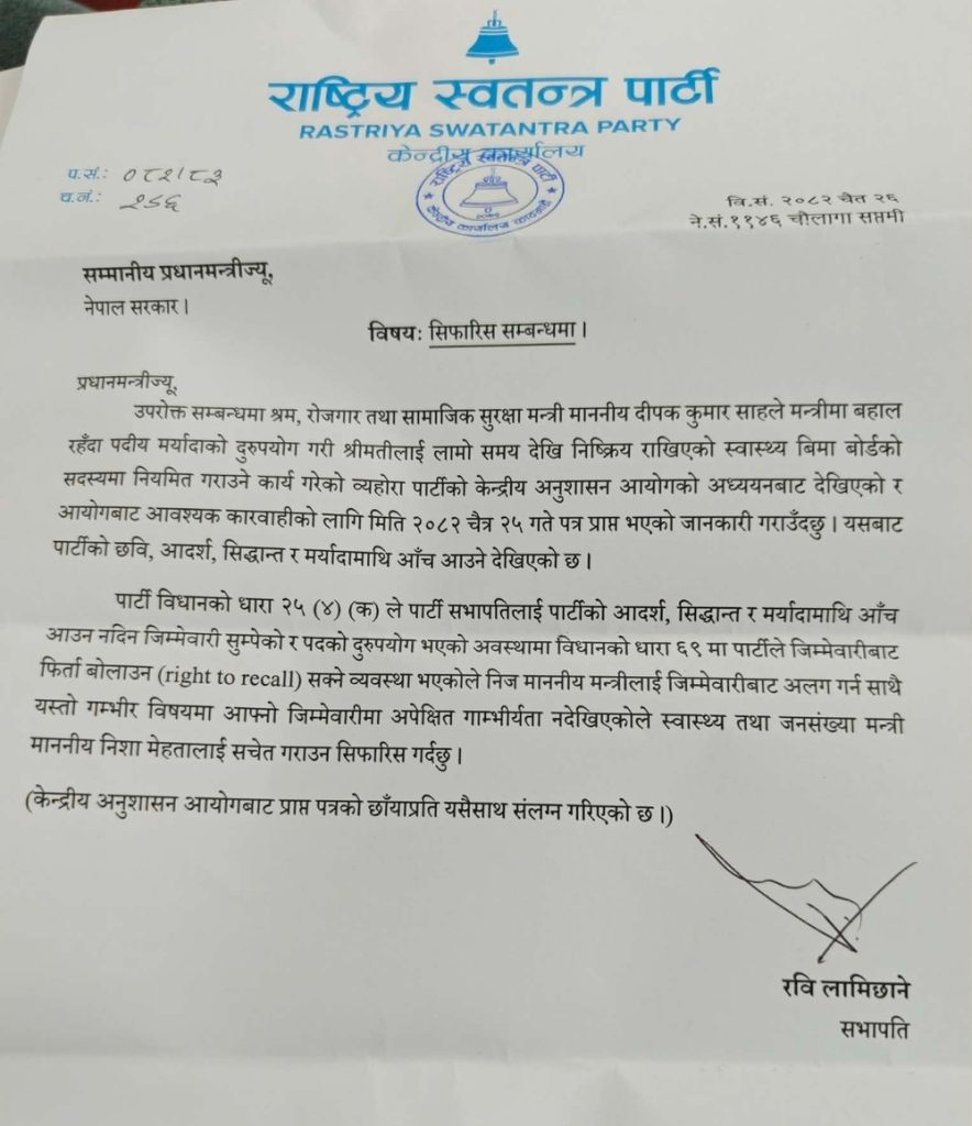‘श्रम, रोजगार तथा सामाजिक सुरक्षा मन्त्री माननीय दीपक कुमार साहले मन्त्रीमा बहाल रहँदा पदीय मर्यादाको दुरुपयोग गरी श्रीमतीलाई लामो समय देखि निष्क्रिय राखिएको स्वास्थ्य बिमा बोर्डको सदस्यमा नियमित गराउने कार्य गरेको व्यहोरा पार्टीको केन्द्रीय अनुशासन आयोगको अध्ययनबाट देखिएको र आयोगबाट आवश्यक कारवाहीको लागि मिति २०८२ चैत्र २५ गते पत्र प्राप्त भएको जानकारी गराउँदछु । यसबाट पार्टीको छवि, आदर्श, सिद्धान्त र मर्यादामाथि आँच आउने देखिएको छ,’ लामिछानेले भनेका छन् ।