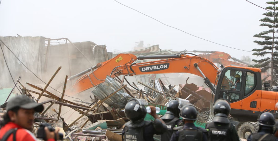 सरकारको निर्देशनअनुसार संरचना हटाउन नेपाल प्रहरी, सशस्त्र प्रहरी बल तथा काठमाडौँ महानगर प्रहरीको संयुक्त टोलीले शनिबार दिनभरि प्रभावित बासिन्दा र सरसामान सुरक्षित रूपमा सार्न सहयोग गरेको थियो । त्यसपछि मात्र डोजर प्रयोग गरी संरचना हटाउने काम गरिएको थियो ।